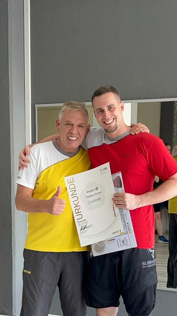 Am 26.07.25 hat unser Trainer und Schulleiter Sebastian Hoffmann den 5. Meistergrad von Großmeister Thomas Schrön verliehen bekommen. Wir gratulieren zu diesem grandiosen Erfolg!